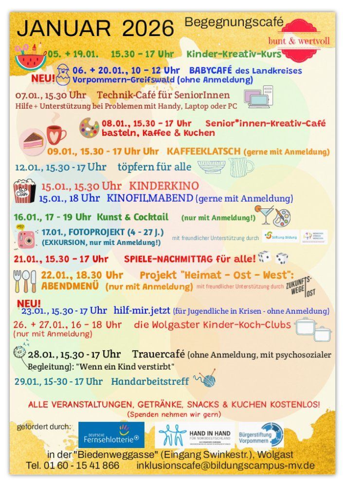 Alle Angebote sind kostenlos, dazu gibt es - ebenfalls kostenlos - warme und kalte Getränke, Kekse oder kleine Snacks - je nach Veranstaltungsformat. Wir haben eine Spendendose - jede/r gibt, was möglich ist. Für einige Angebote ist unbedingt eine Voranmeldung notwendig, die Plätze sind schnell ausgebucht! Schreibt uns eine Nachricht an inklusionscafe@bildungscampus-mv.de oder eine WA an 01 60 - 15 41 866 oder ruft an.