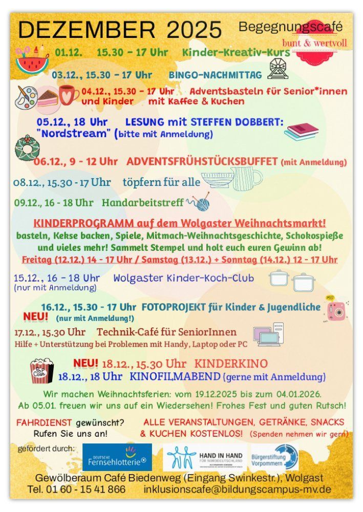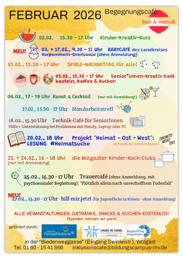 Seit 01.06.2025 kann es nur dank Förderungen durch die "Deutsche Fernsehlotterie" und durch "Hand in Hand für Norddeutschland" als Begegnungscafé weitergeführt werden! Wir danken an dieser Stelle auch ausdrücklich der Bürgerstiftung Greifswald für die Unterstützung.